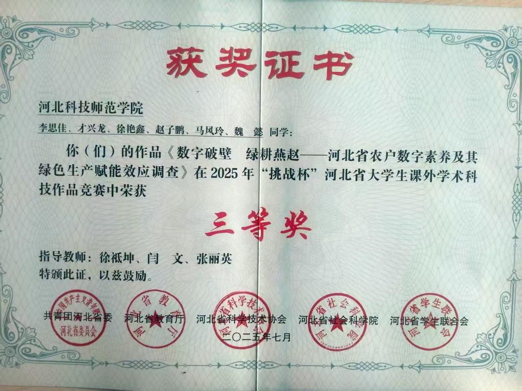 近日,共青团河北省委员会、河北省教育厅公布了2025年“挑战杯”河北省大学生课外学术科技作品竞赛获奖名单。我院研究生牛欣悦、左亿薇的作品《餐桌上的“冀”菜——全产业链视角下河北净菜的发展路径探究》(指导教师:徐祗坤、高雅斌、王晓东)和李思佳、才兴龙、徐艳鑫、赵子鹏、马风玲、魏懿同学的作品《数字破壁 绿耕燕赵——河北省农户数字素养及其绿色生产赋能效应调查》(指导教师:徐祗坤、闫文、张丽英)分获省级一等奖和三等奖。(编辑:路荞华  审核:徐祗坤)